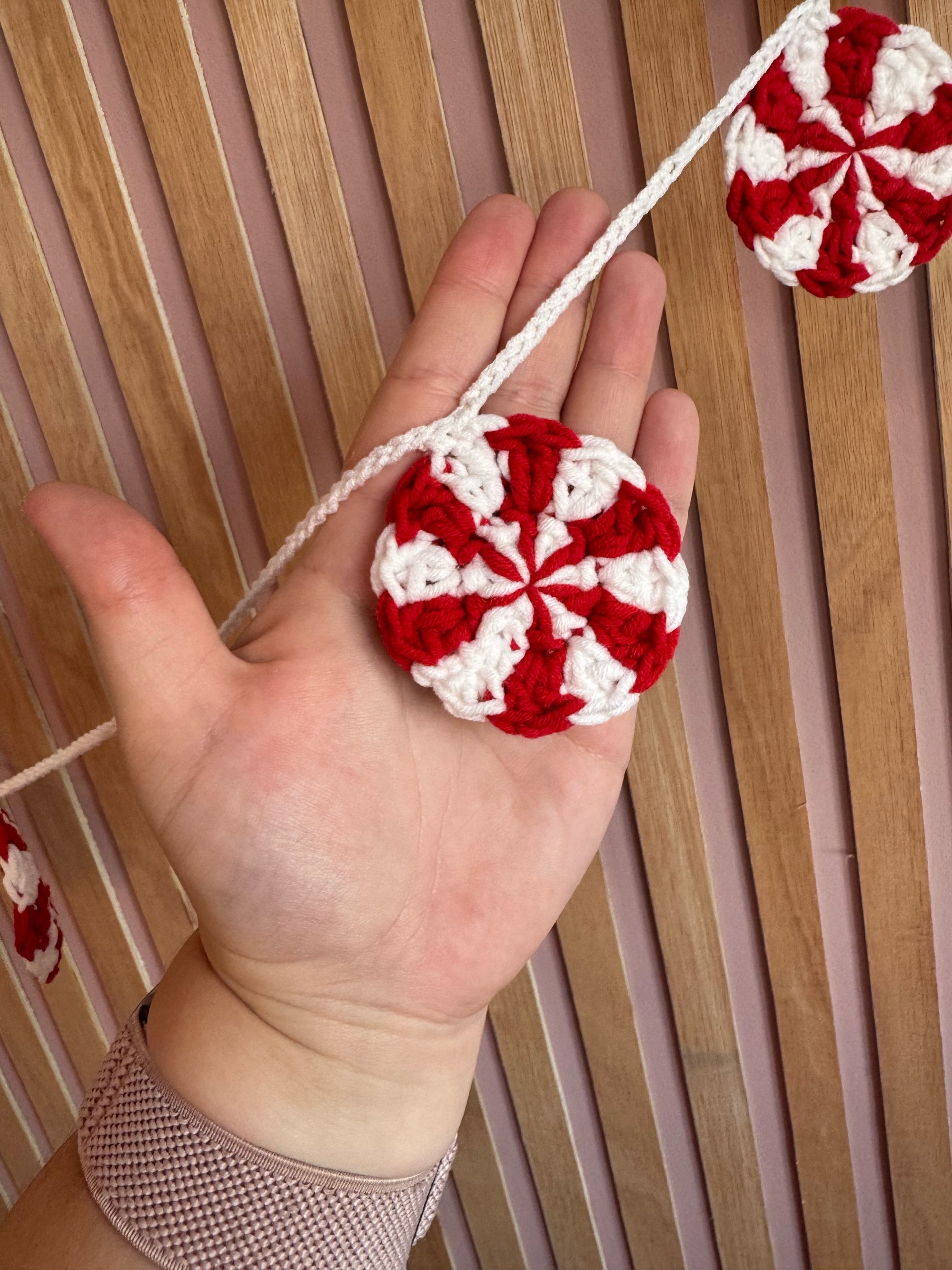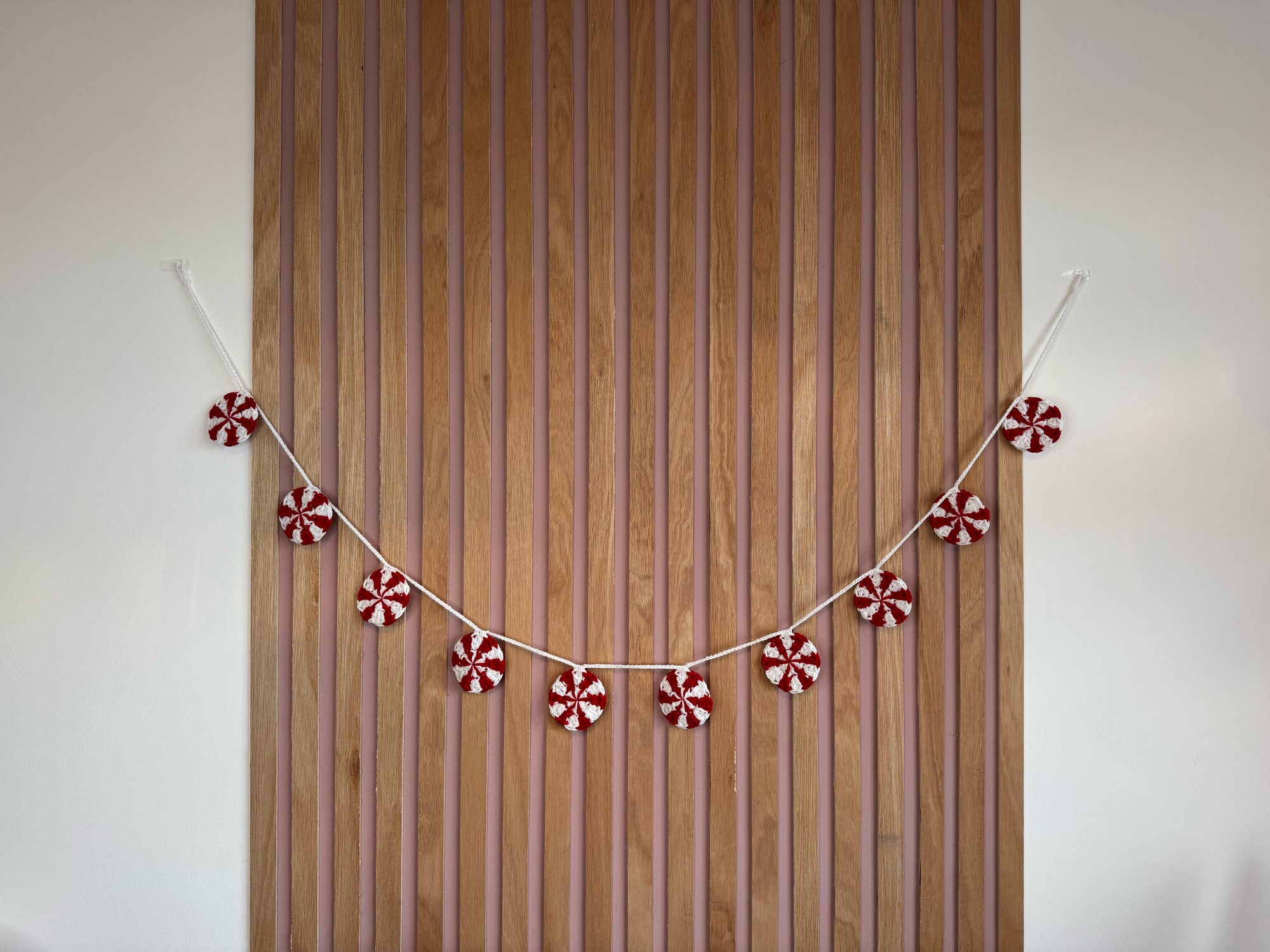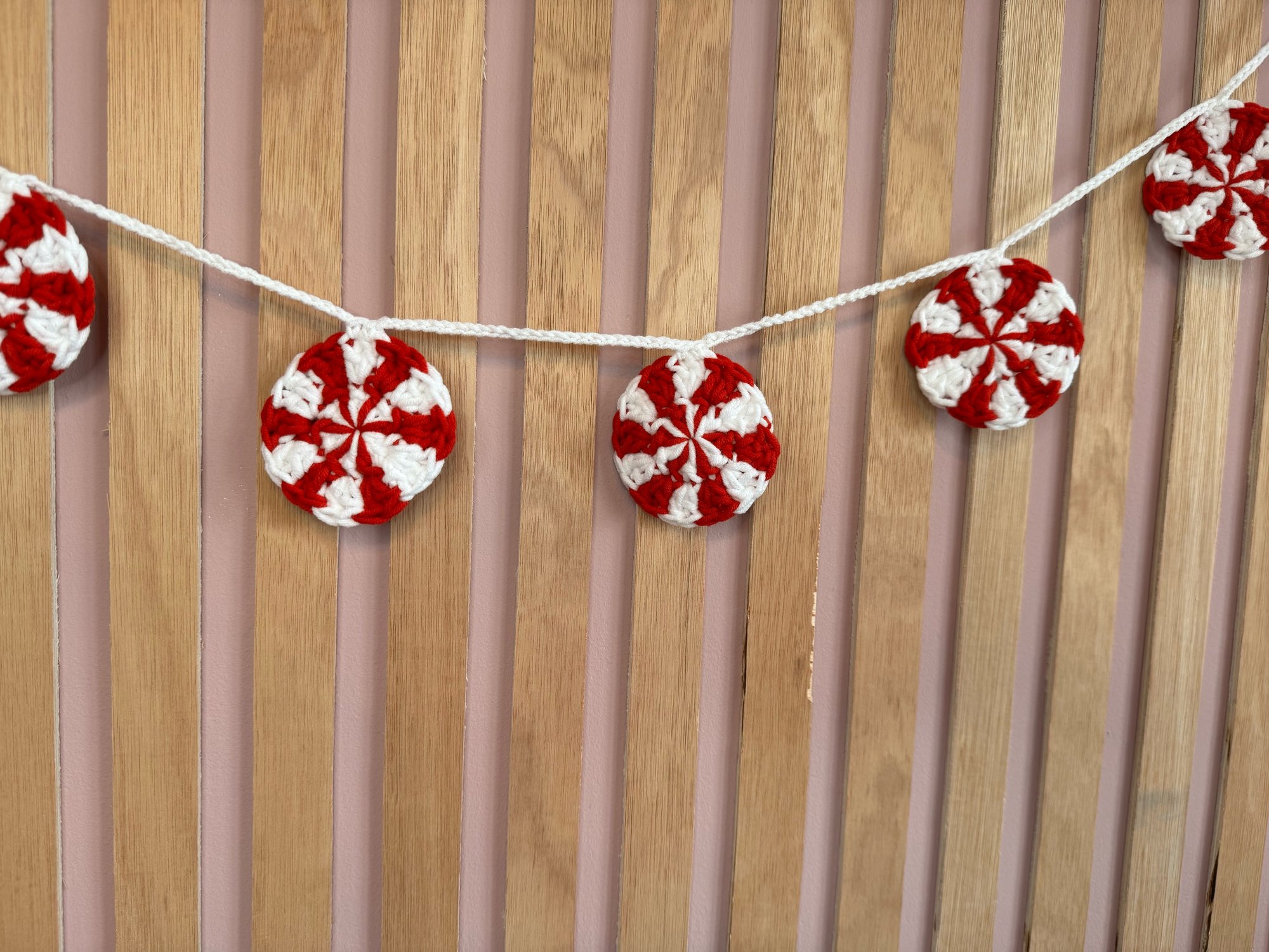 Handmade Christmas garlands are the perfect home decor accessory to add to any room to bring the festive cheer. Each individual candy stripe disk has been handmade and are a blended cotton acrylic yarn. Each garland has 10 crochet striped candy.